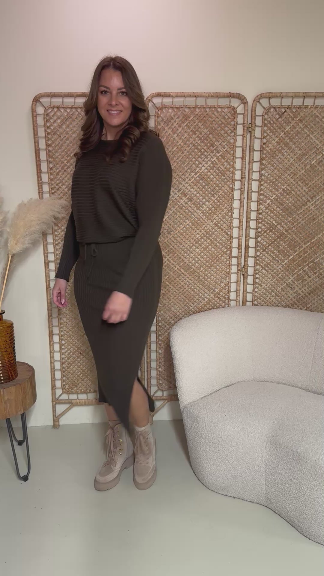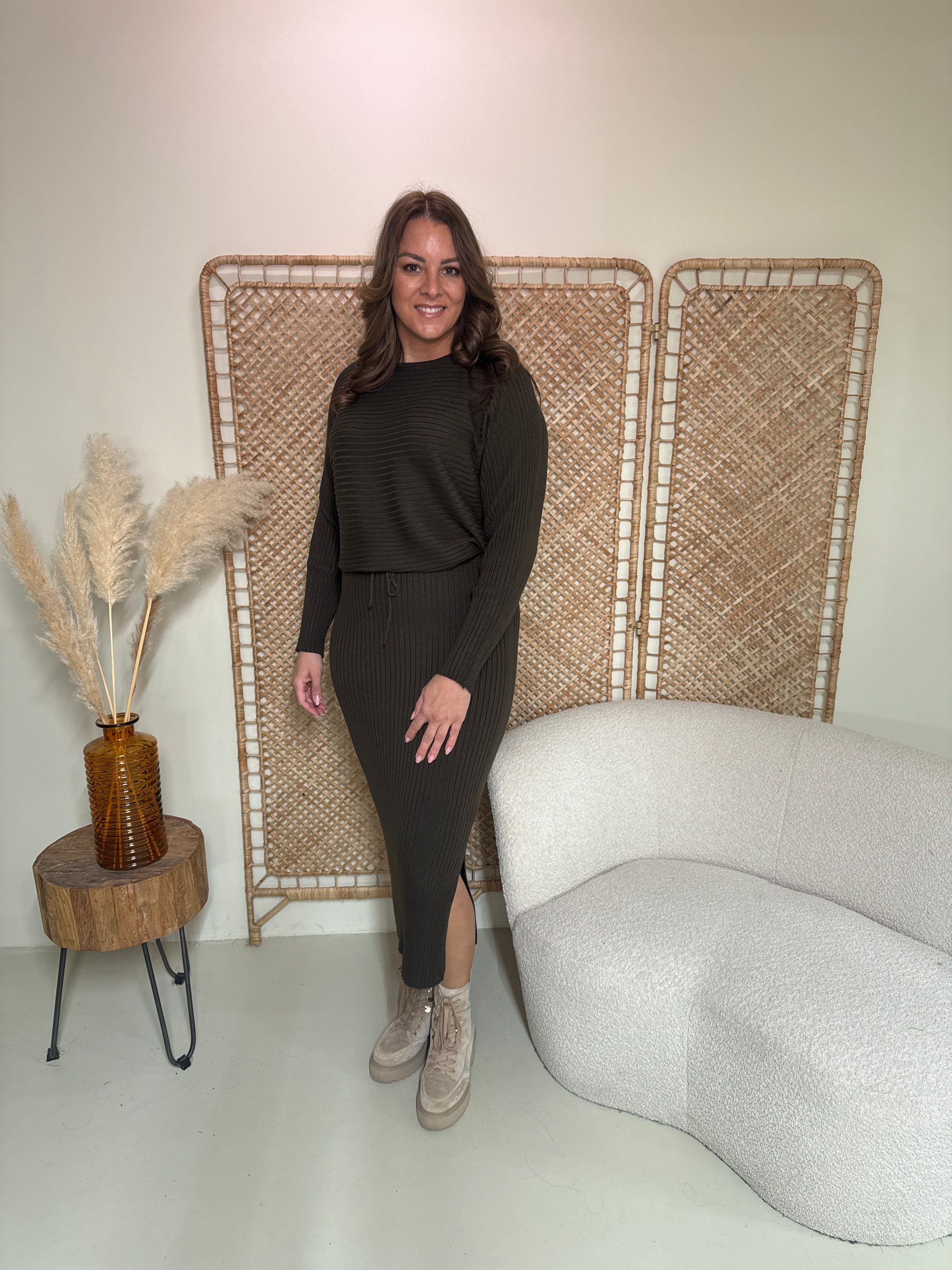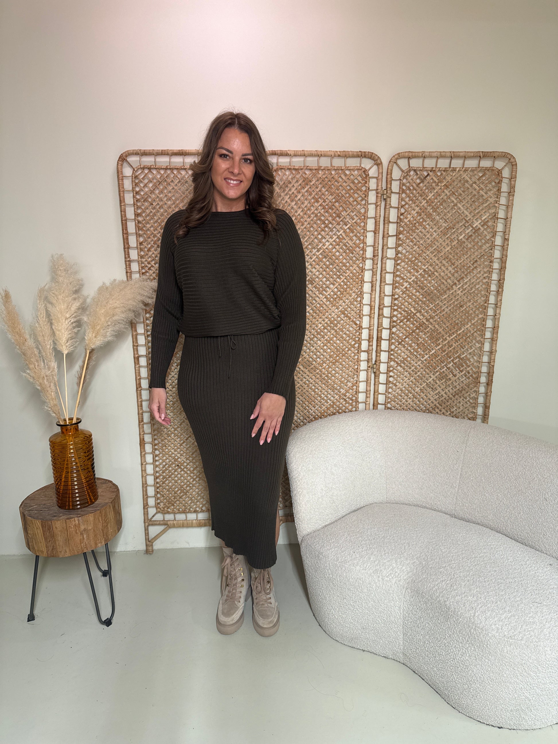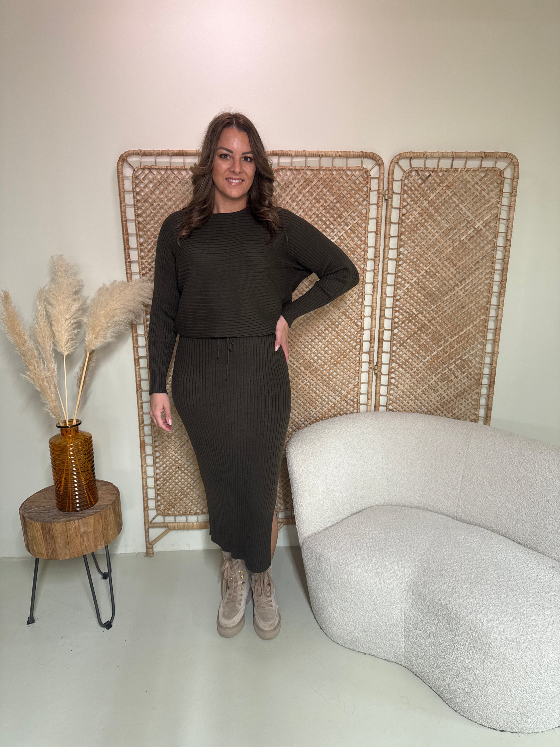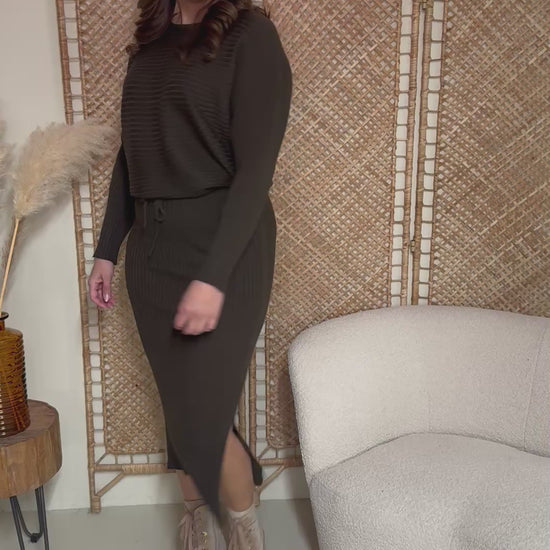 Machen Sie es sich mit diesem wunderbaren zweiteiligen Set bequem. Das Set besteht aus einem übergroßen Pullover und einem Rock und enthält viel Stretch.