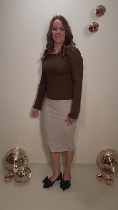 Dieses braune Oberteil mit Smock-Struktur schmiegt sich schön an, ohne einzuengen. Der Stoff ist dehnbar, leicht und fühlt sich weich auf der Haut an. Der U-Boot-Ausschnitt und die leicht ausgestellten Ärmel verleihen dem Ganzen etwas mehr Form, ohne zu sehr aufzufallen.