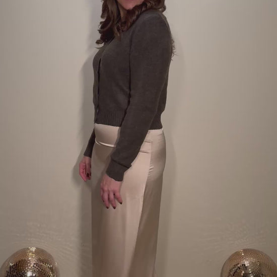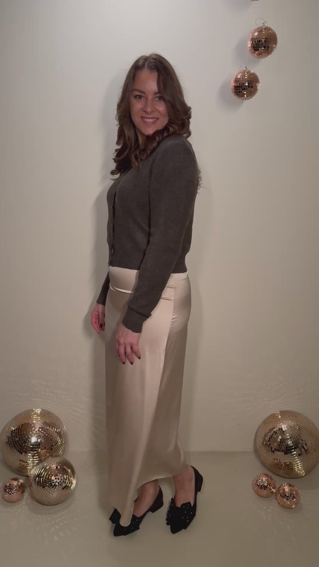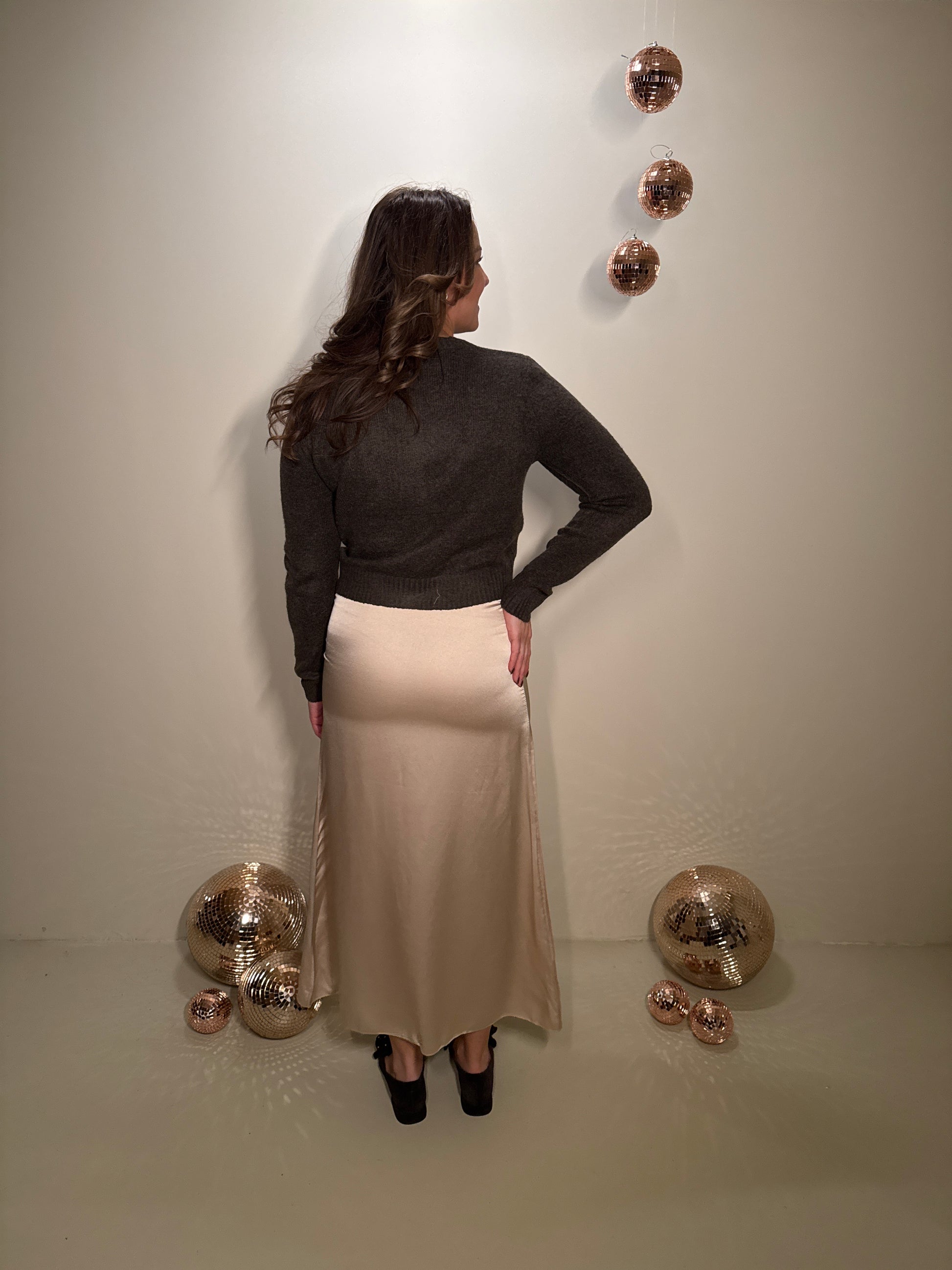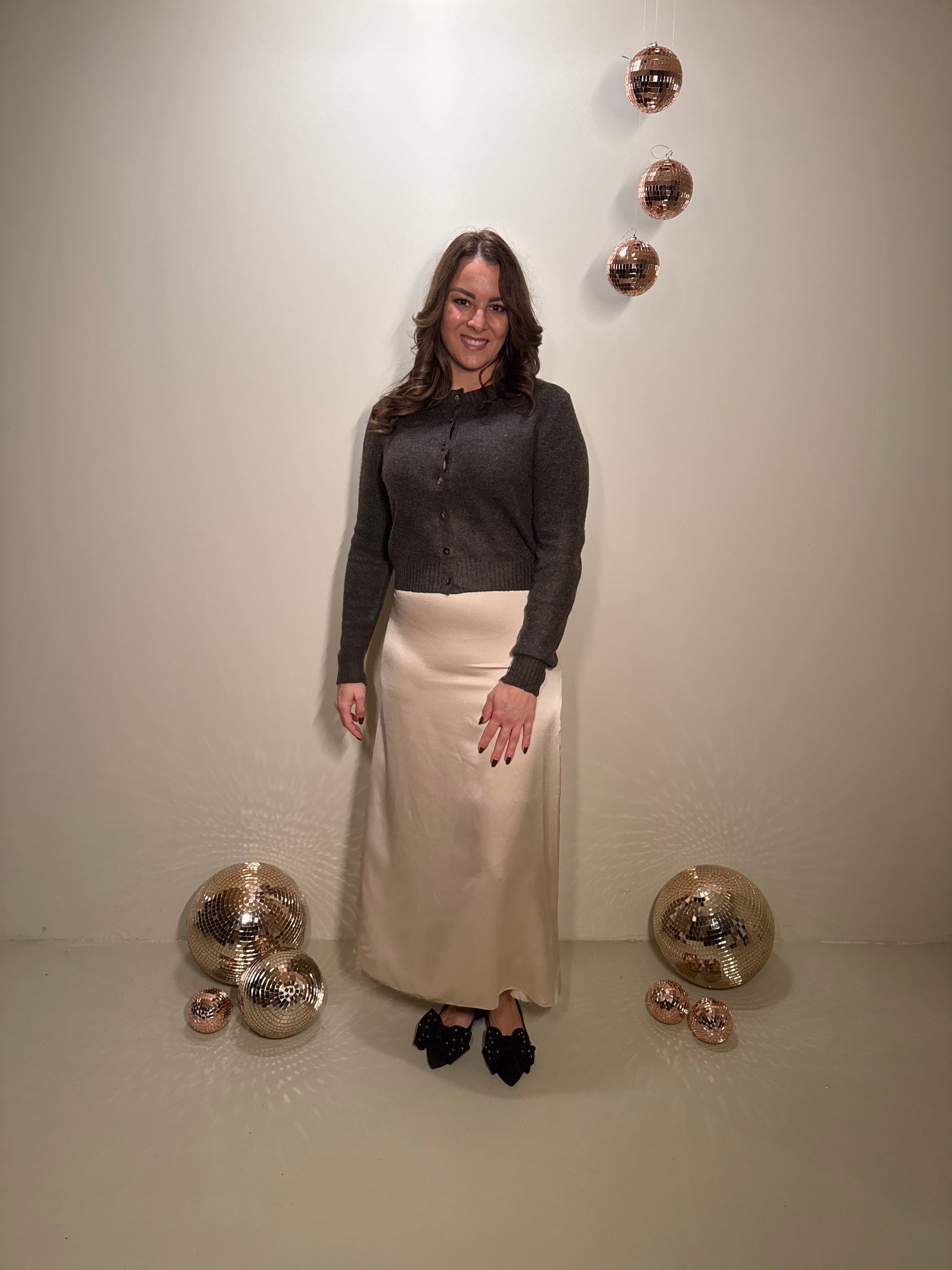 Deze soepelvallende rok met satijnlook is zo’n item dat je eindeloos kunt combineren. De brede stretchband in de taille zit fijn, ook als je zwanger bent, En de stof valt mooi langs je lichaam zonder te strak te zitten.
