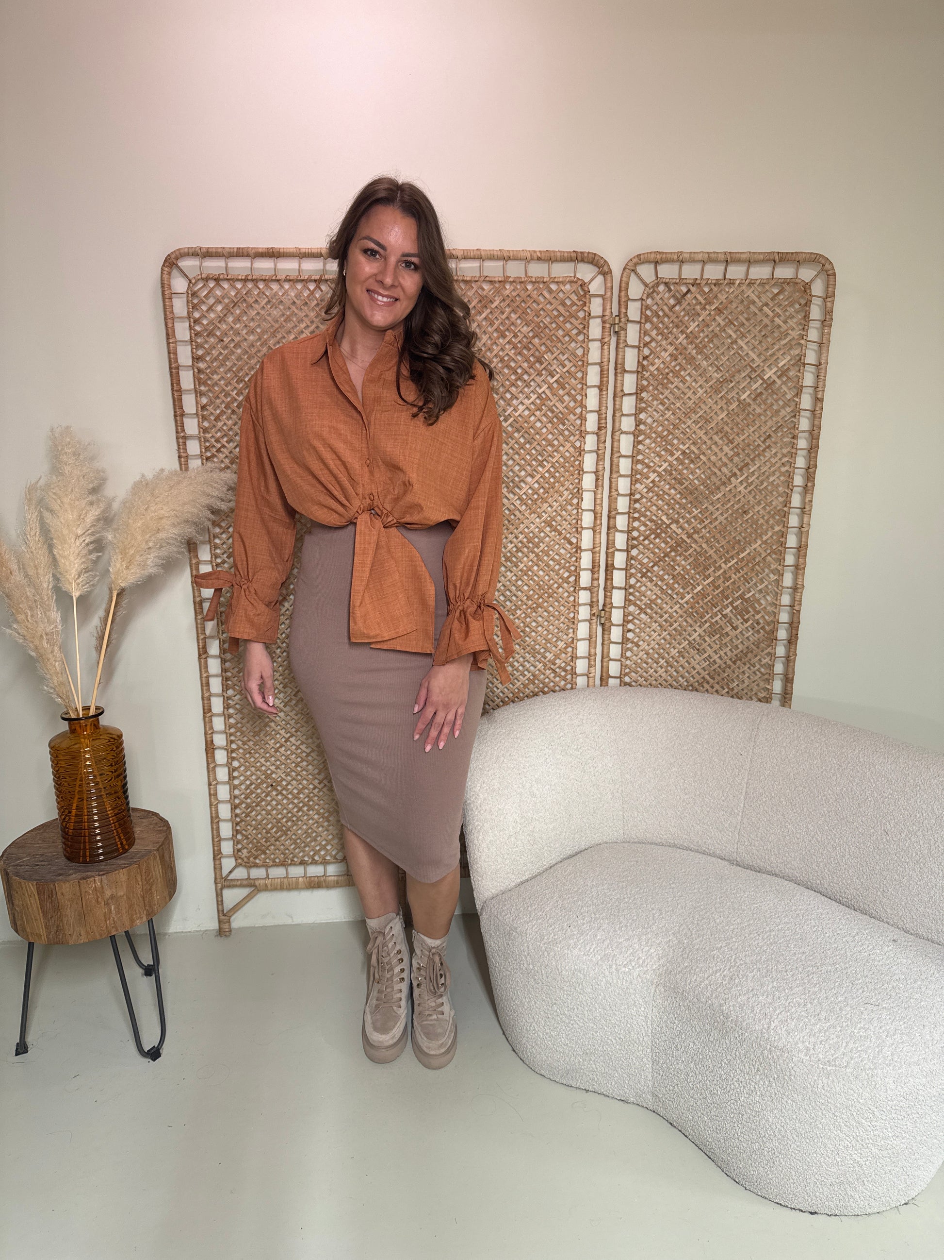 Je kan de top eindeloos combineren, en omdat het een kort model is kan hij ook zwangerproof! De top heeft een opstaande kraag, knoopjes en een elastieke band zodat hij mooi aansluit. De mouwen hebben een leuk strik detail die zelf te stellen is.