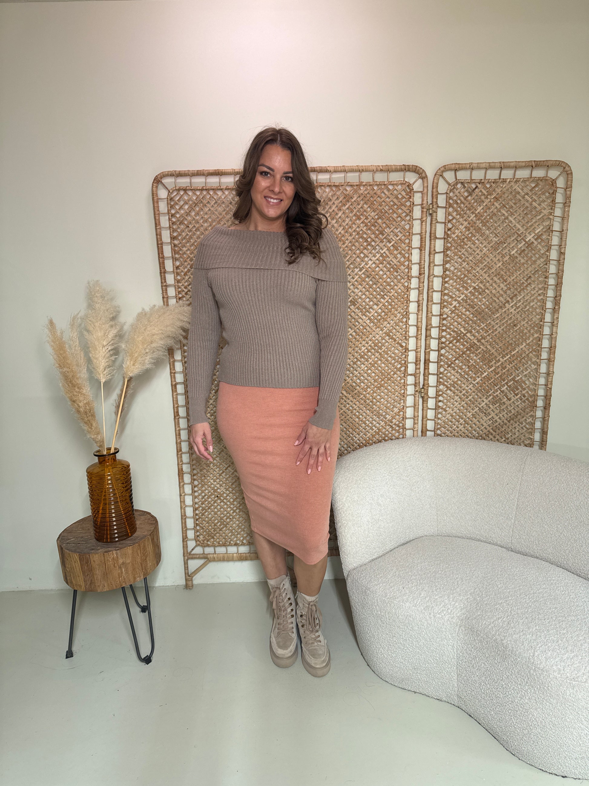 Deze top heeft een rustige, vrouwelijke uitstraling en is perfect voor het voorjaar. De brede halslijn valt mooi over de schouders en geeft een zachte, elegante look. De ribstructuur zorgt voor een fijne stretch waardoor de top comfortabel meebeweegt en prettig zit, ook als je lichaam verandert.