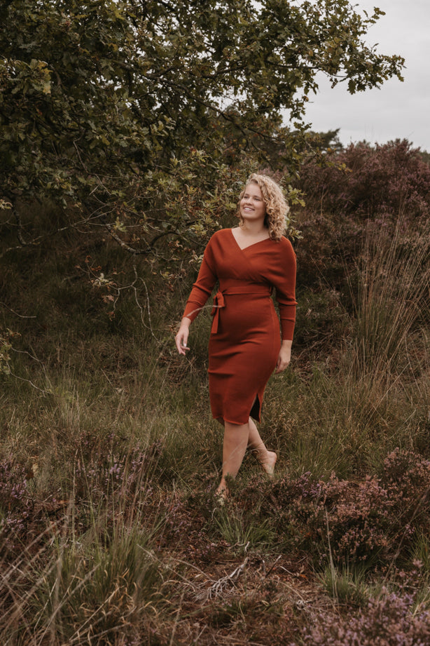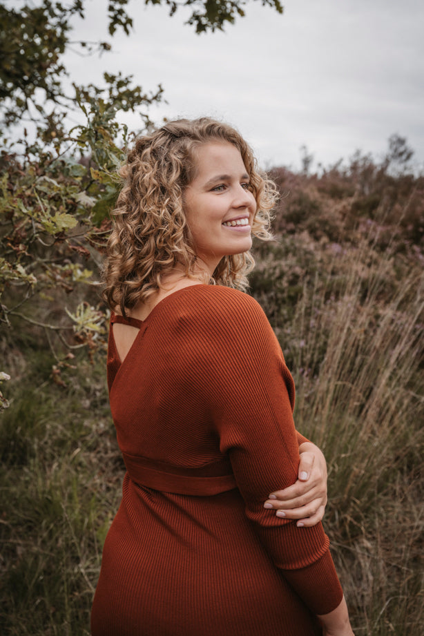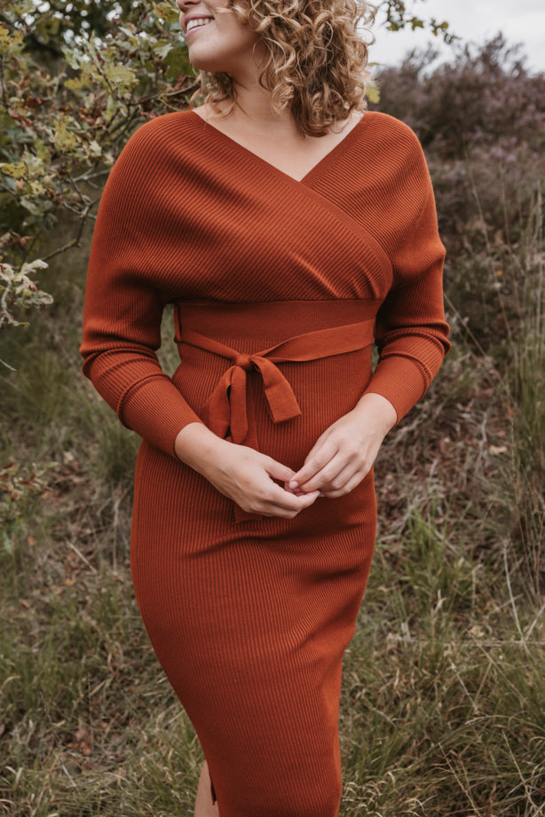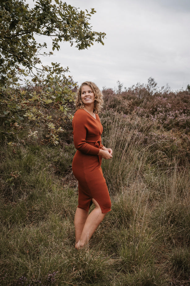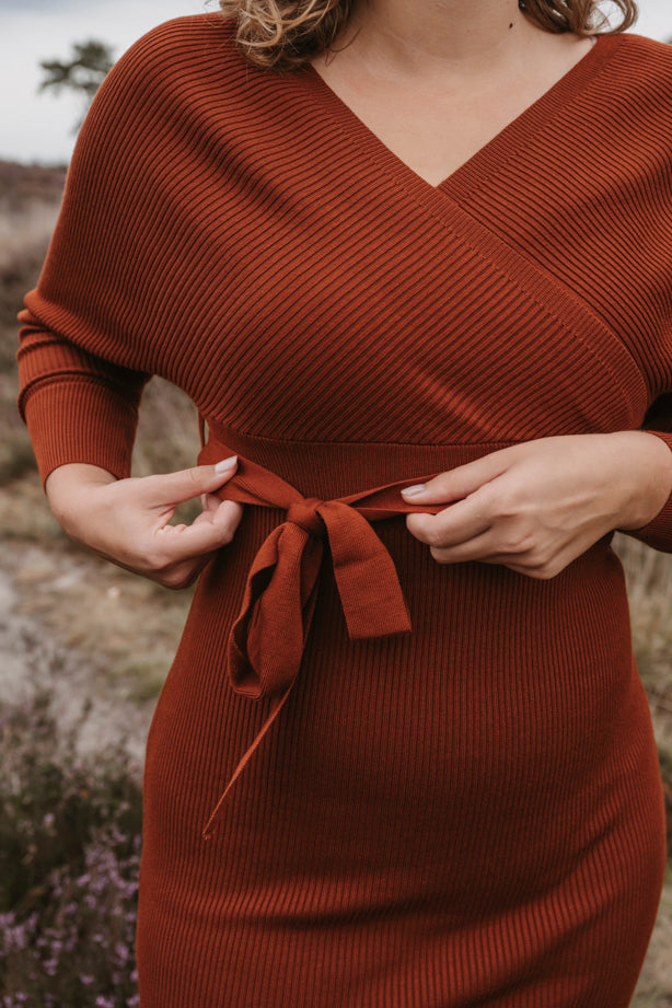 Gemaakt van 100% zachte viscose met een fijne ribstructuur die mooi om je lichaam valt – met of zonder buik. De overslag sluit mooi aan, en met het striklint in de taille geef je zelf vorm aan je silhouet.
