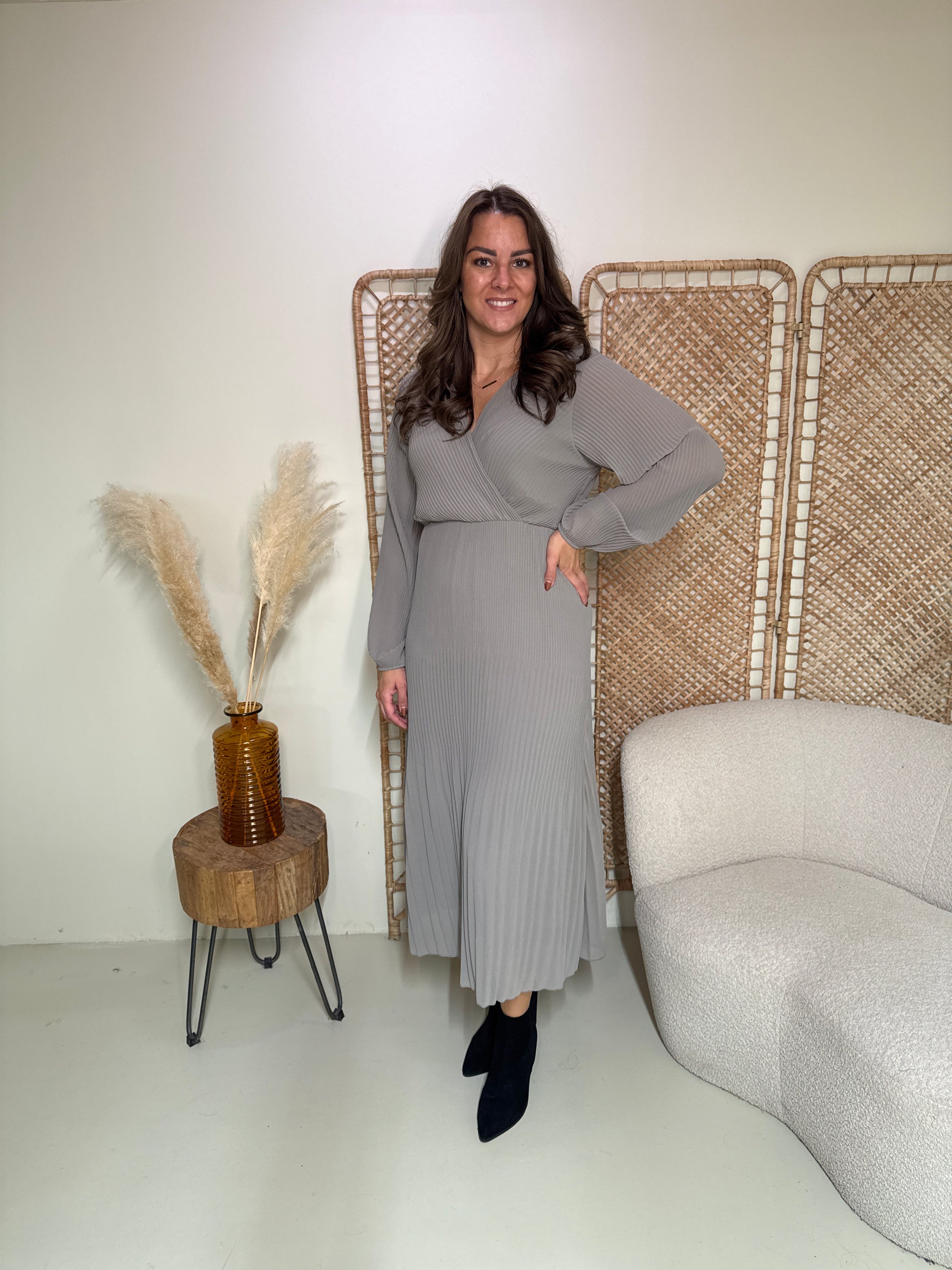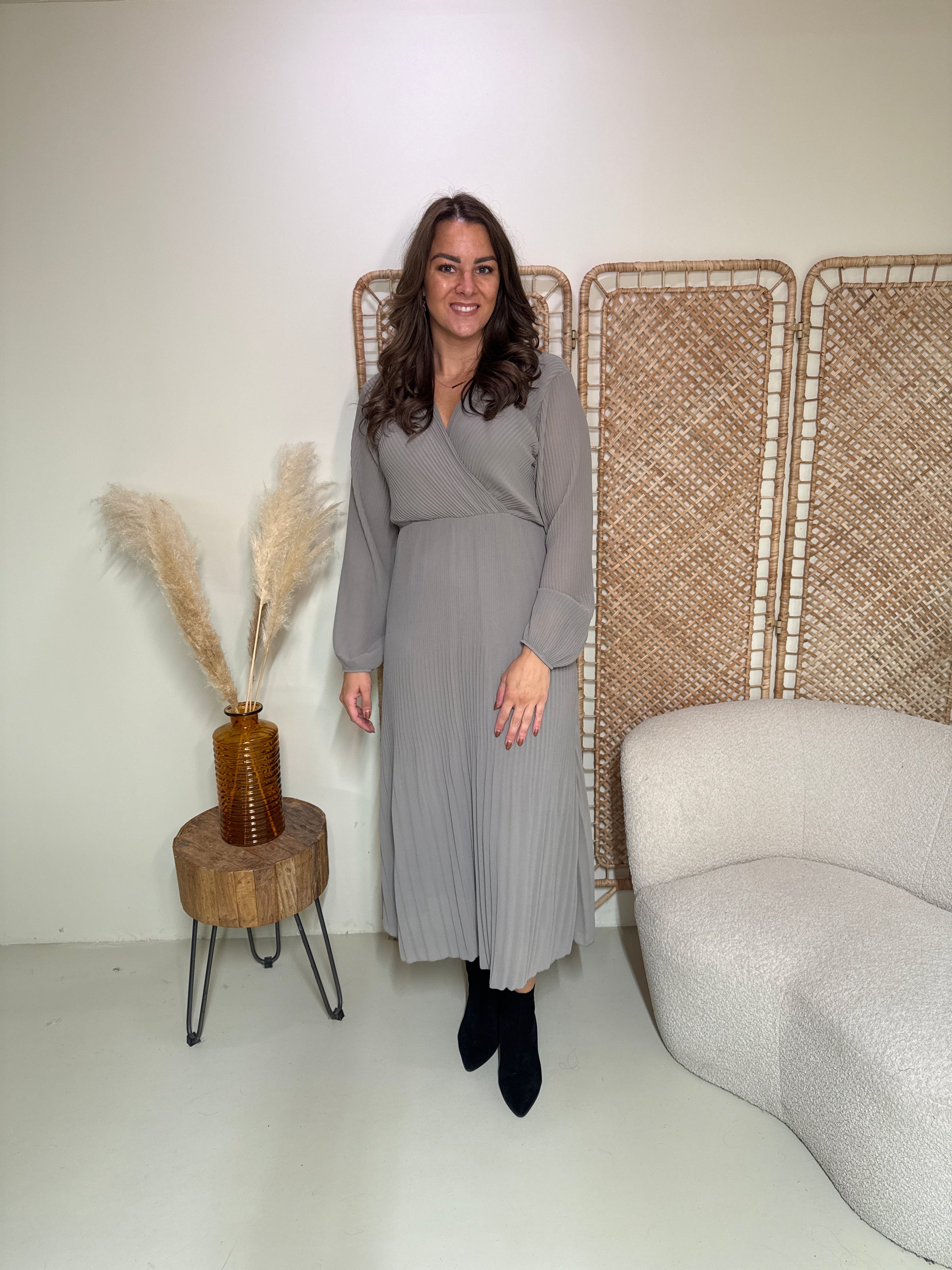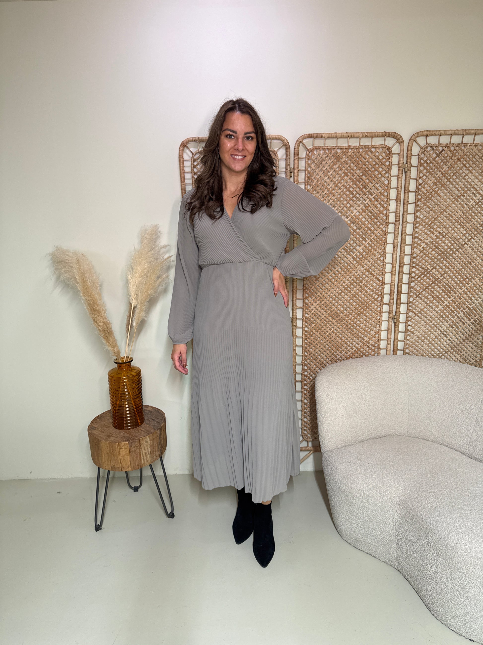 Deze taupe kleurige jurk straalt warmte, elegantie en comfort uit. De plisséstof beweegt zacht met je mee, terwijl de diepe V-hals en luchtige mouwen zorgen voor een verfijnde look. Dankzij de elastische taille valt hij mooi over je buik heen, zonder te strak te zitten.