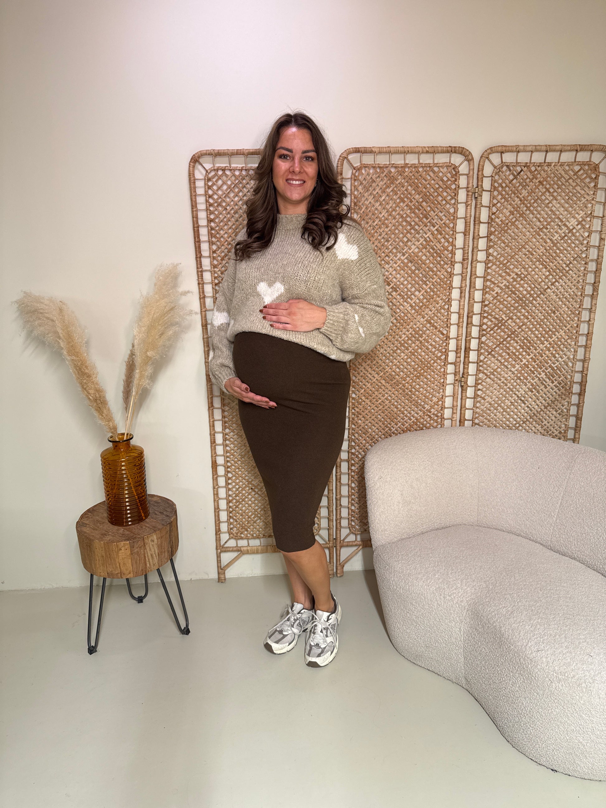 Deze rok is de perfecte mix van vrouwelijk en comfortabel. De stretchy viscosemix bevat veel stretch, waardoor hij moeiteloos meebeweegt met je veranderende lichaam. Hij sluit mooi aan zonder te knellen – precies wat je buik (en jij) nodig hebt tijdens de zwangerschap. De hoge taille benadrukt je silhouet, terwijl de warme chocoladetint makkelijk combineert met zachte neutrale tinten.