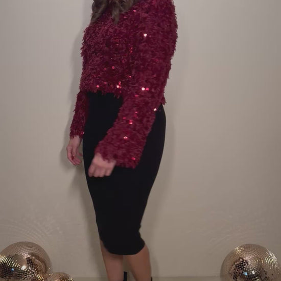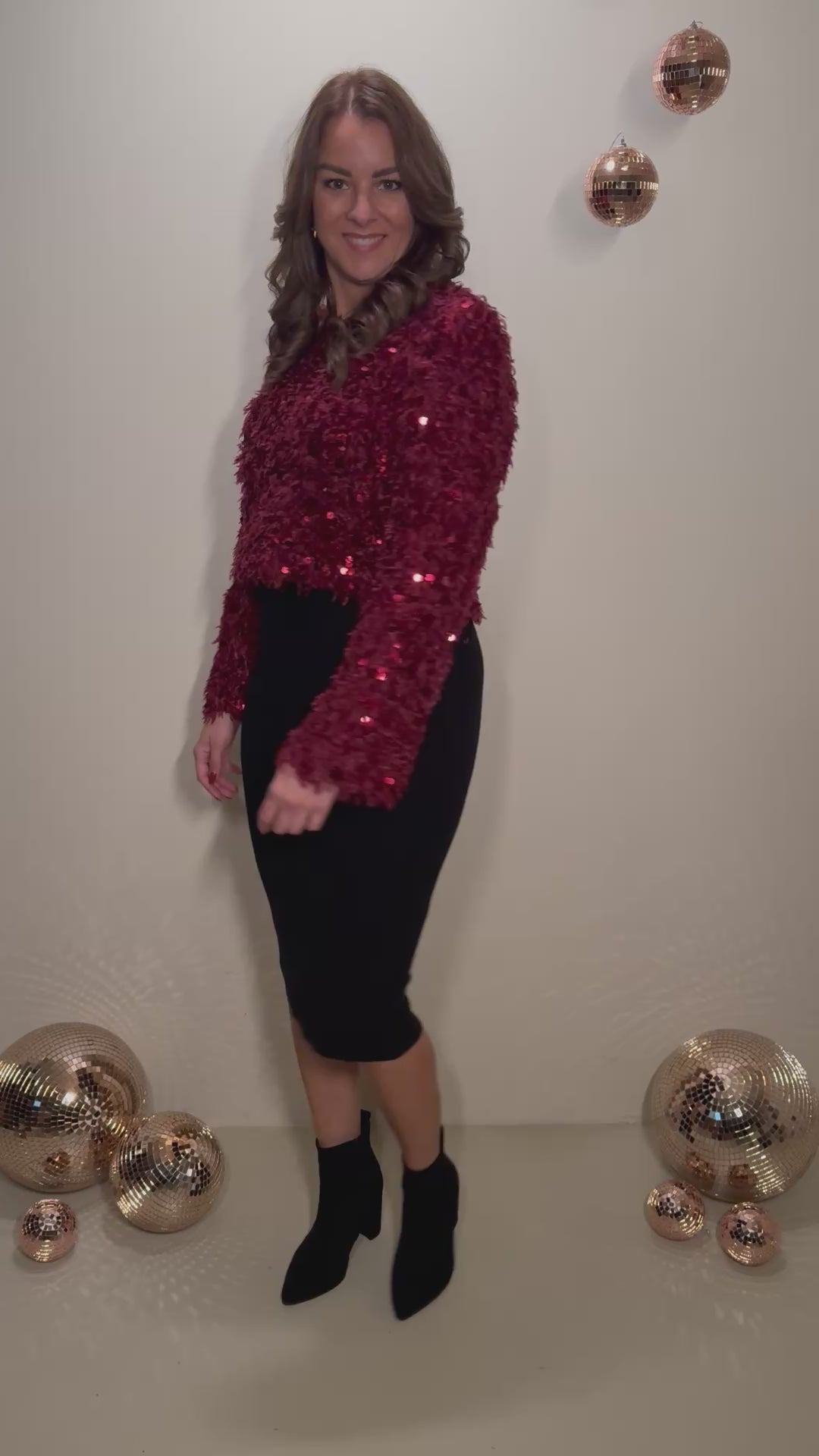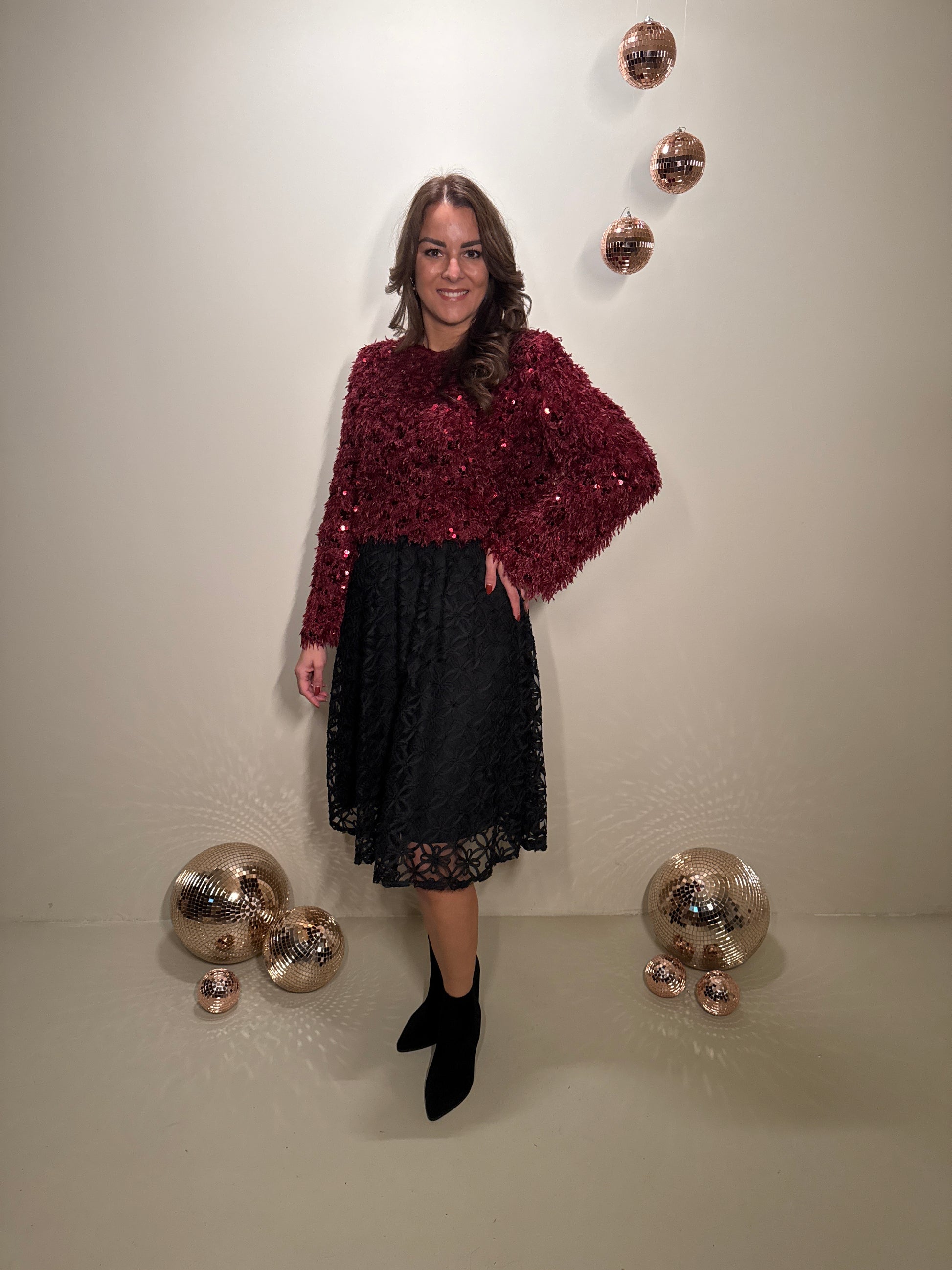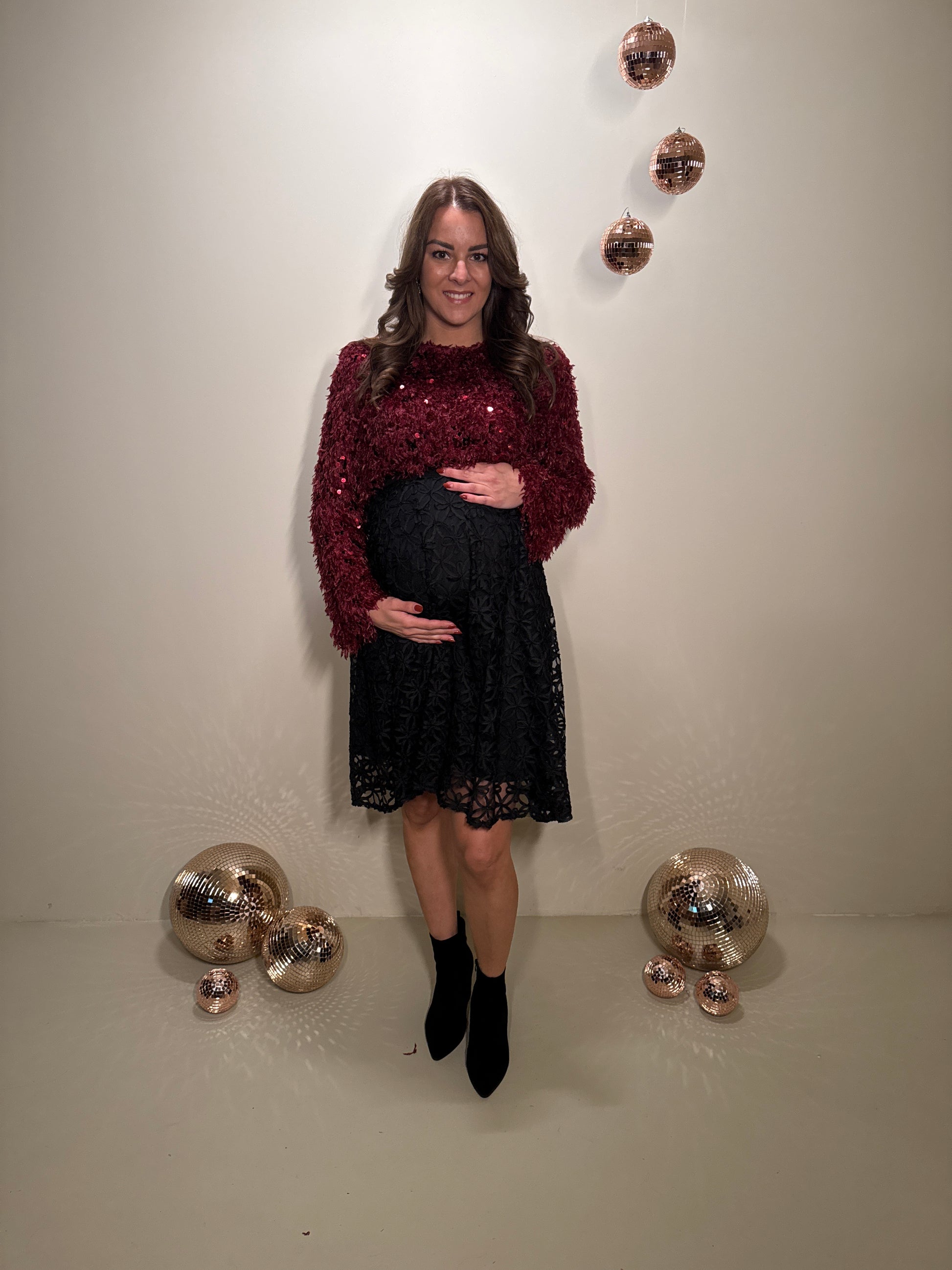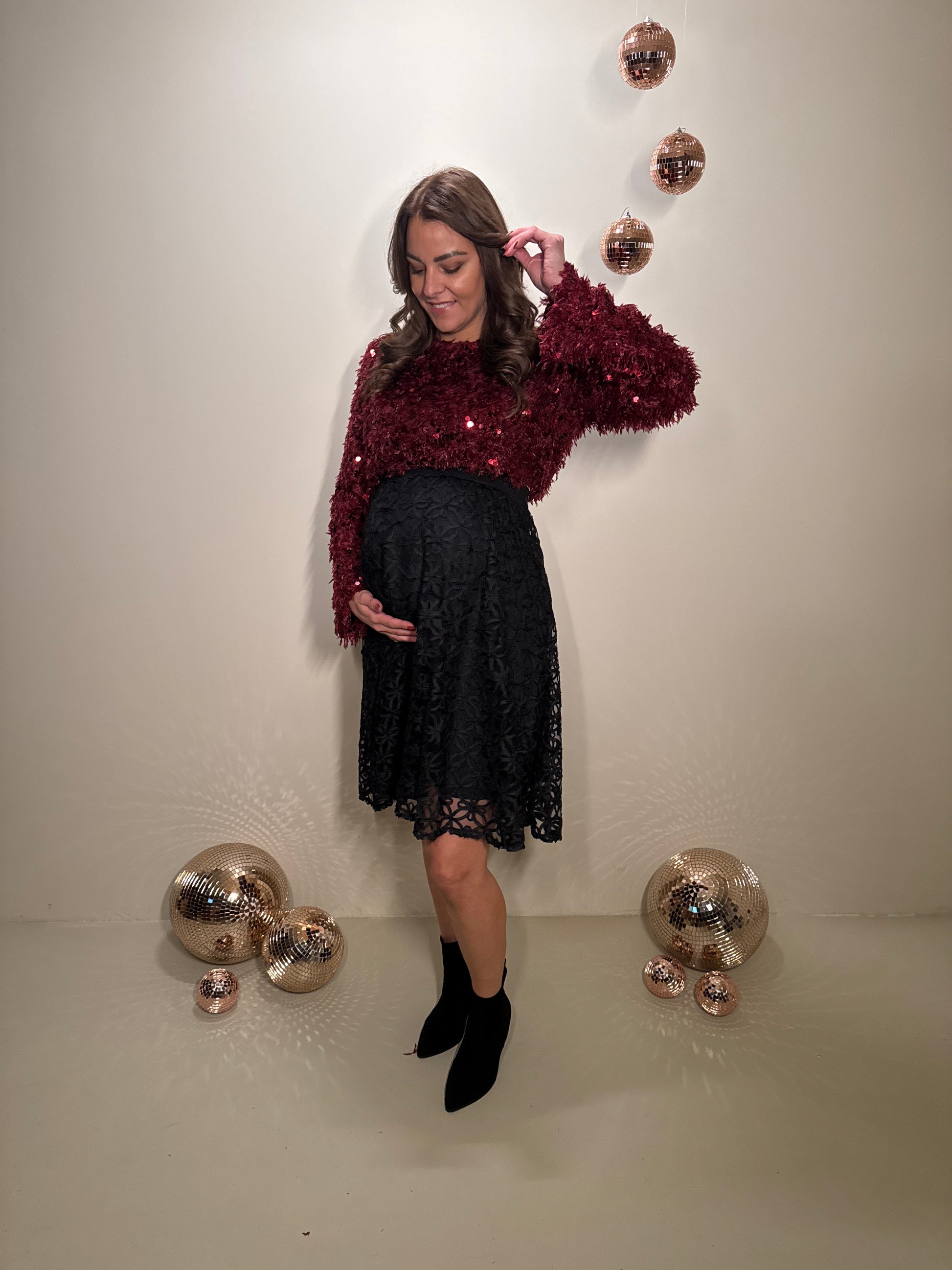 Deze top is een echte blikvanger. De rijke bordeauxrode stof met pailletten en textuur zorgt voor een luxueuze, feestelijke uitstraling. De top sluit achter in de nek met een subtiel knoopje en valt losjes rond het lichaam. Comfortabel én flatterend, ook als je zwanger bent.