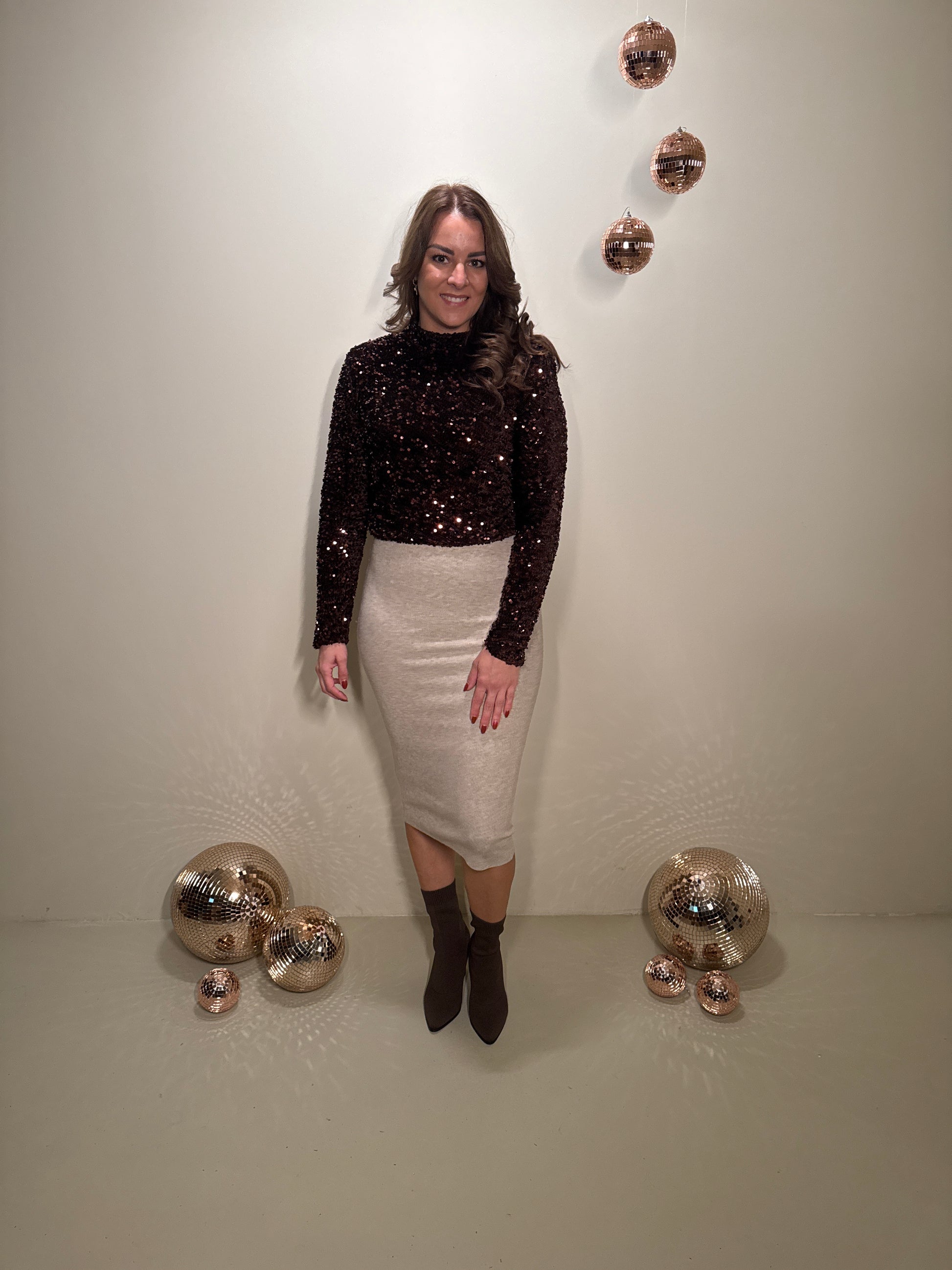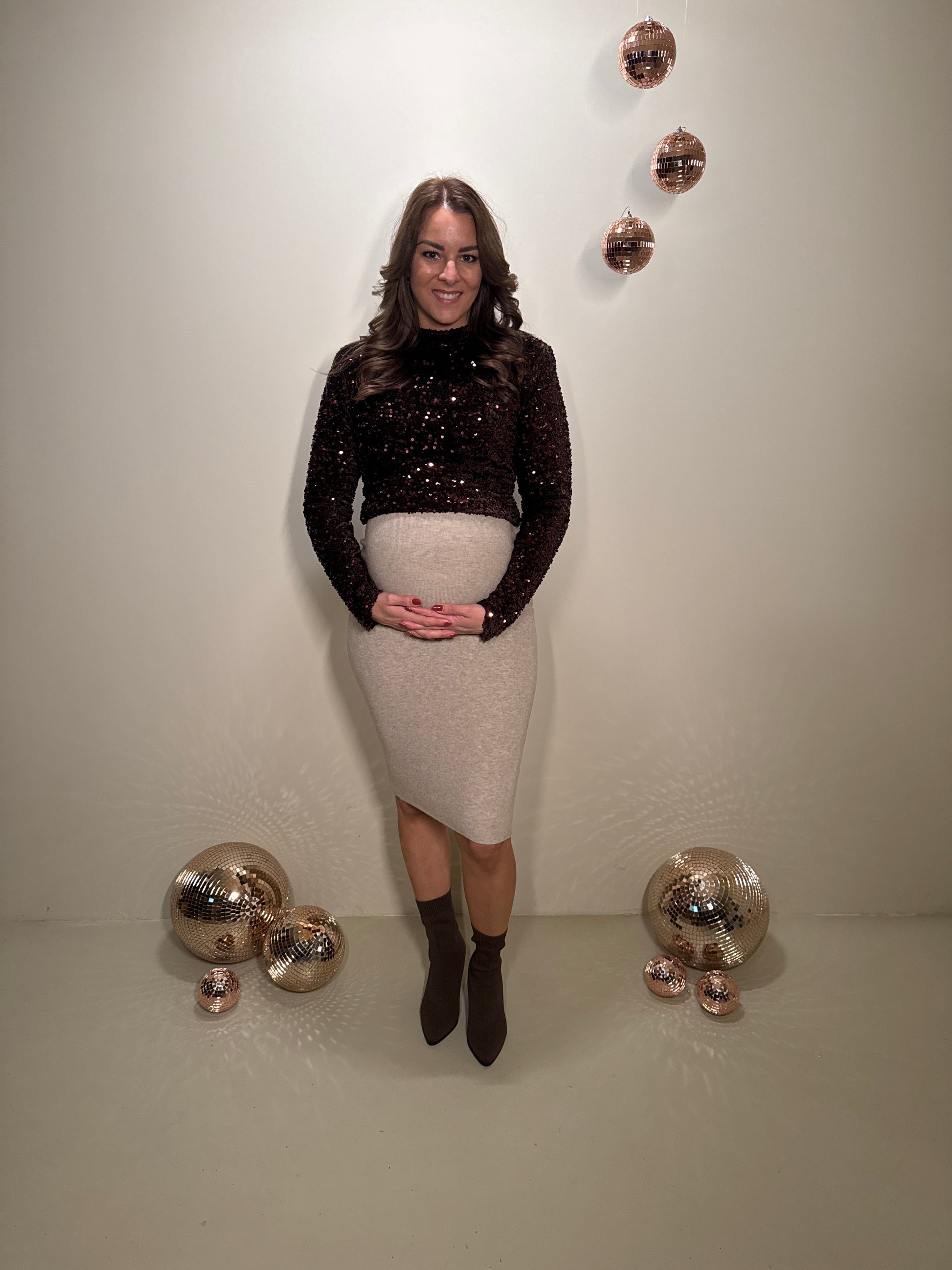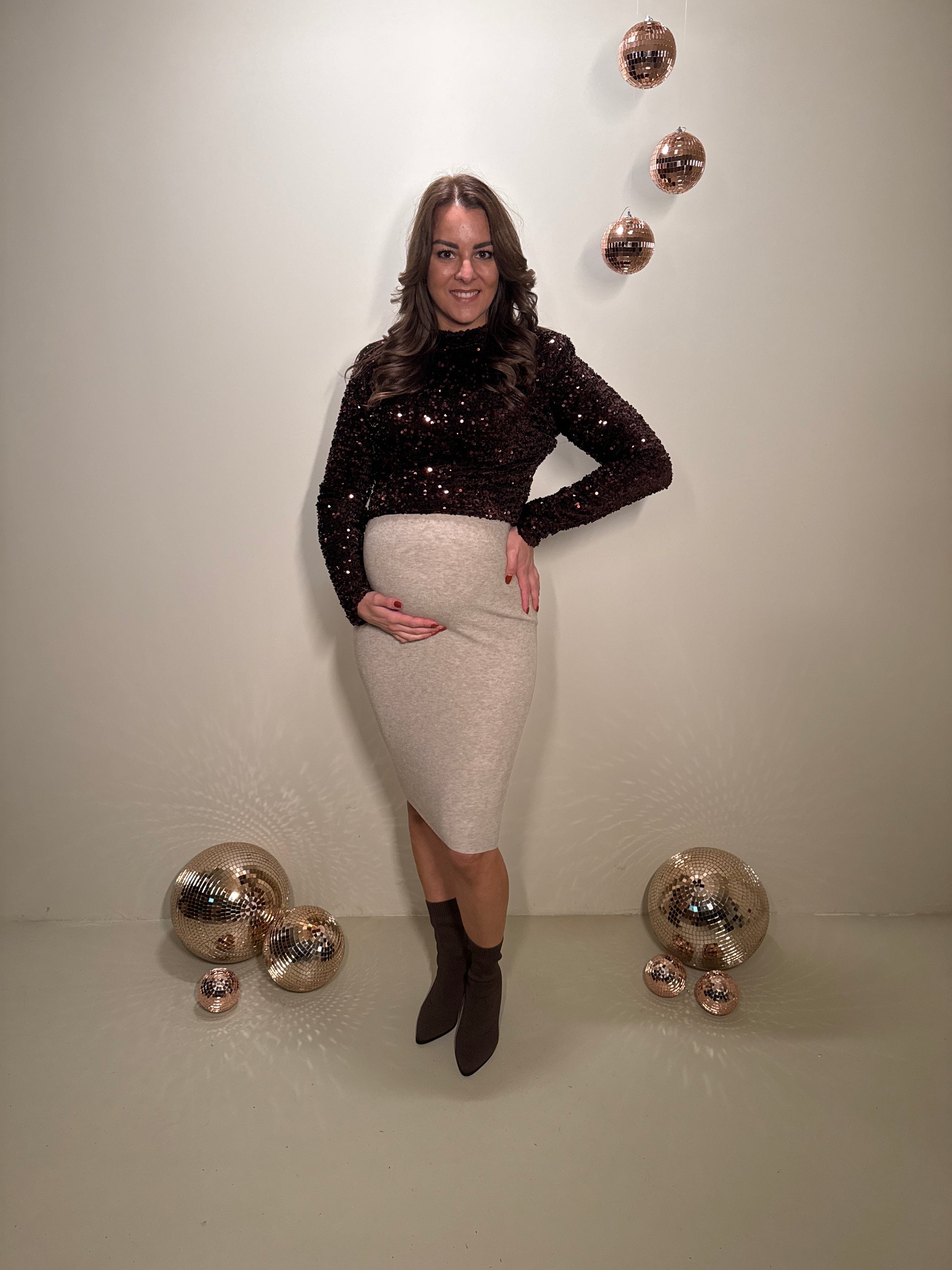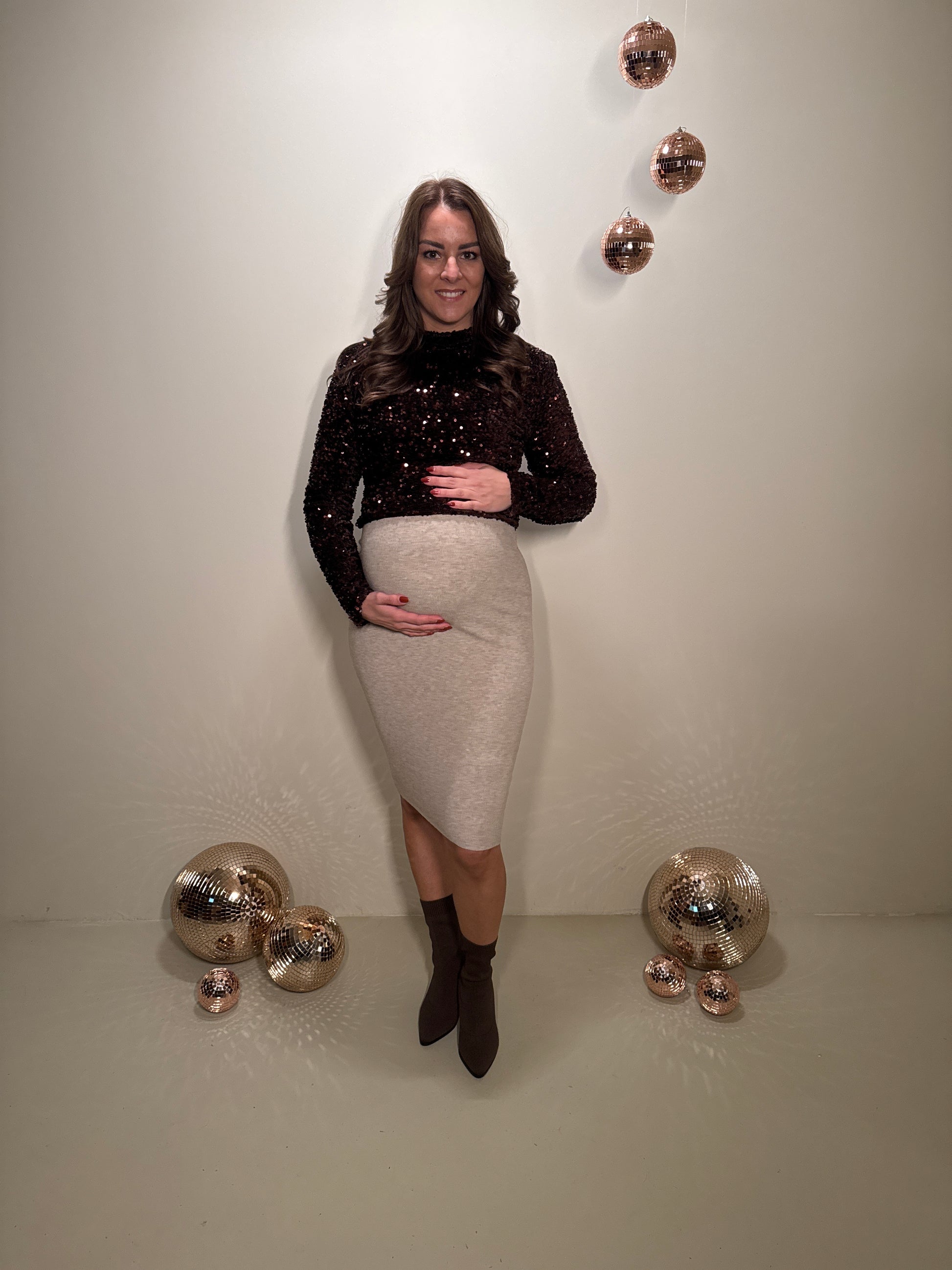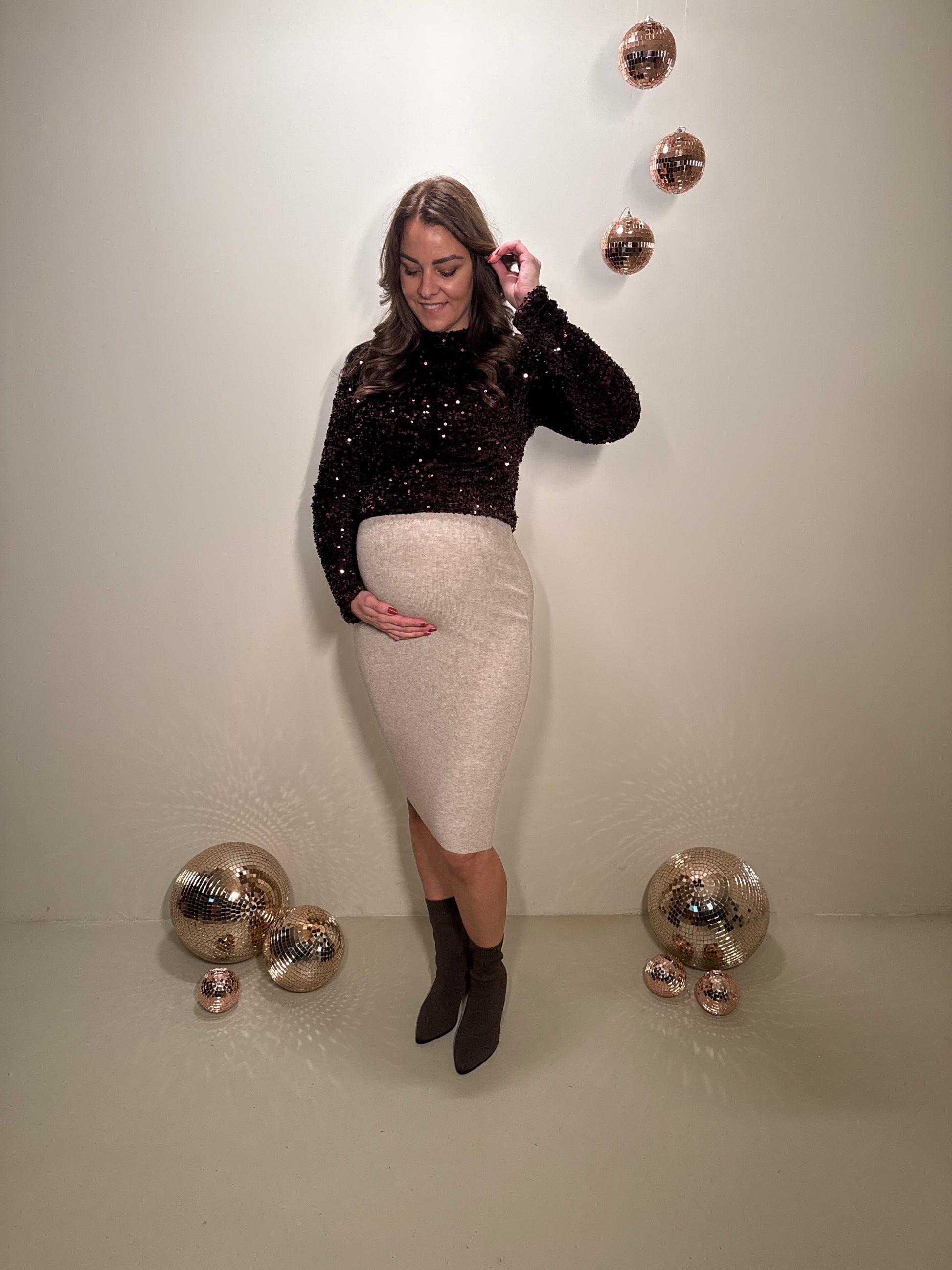 Deze top is gemaakt om in te schitteren. De rijke bruine pailletten vangen prachtig het licht en geven een luxe uitstraling. De rechte pasvorm valt soepel rond het lichaam en biedt genoeg ruimte om ook zwanger te dragen. De subtiele col en lange mouwen zorgen voor een elegante balans tussen feestelijk en comfortabel. Dankzij de rits aan de achterzijde trek je haar makkelijk aan en blijft de pasvorm mooi.