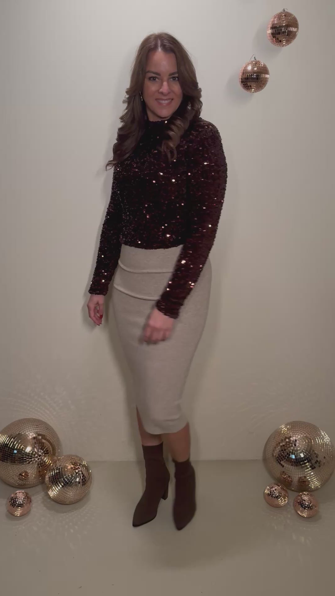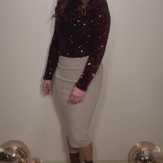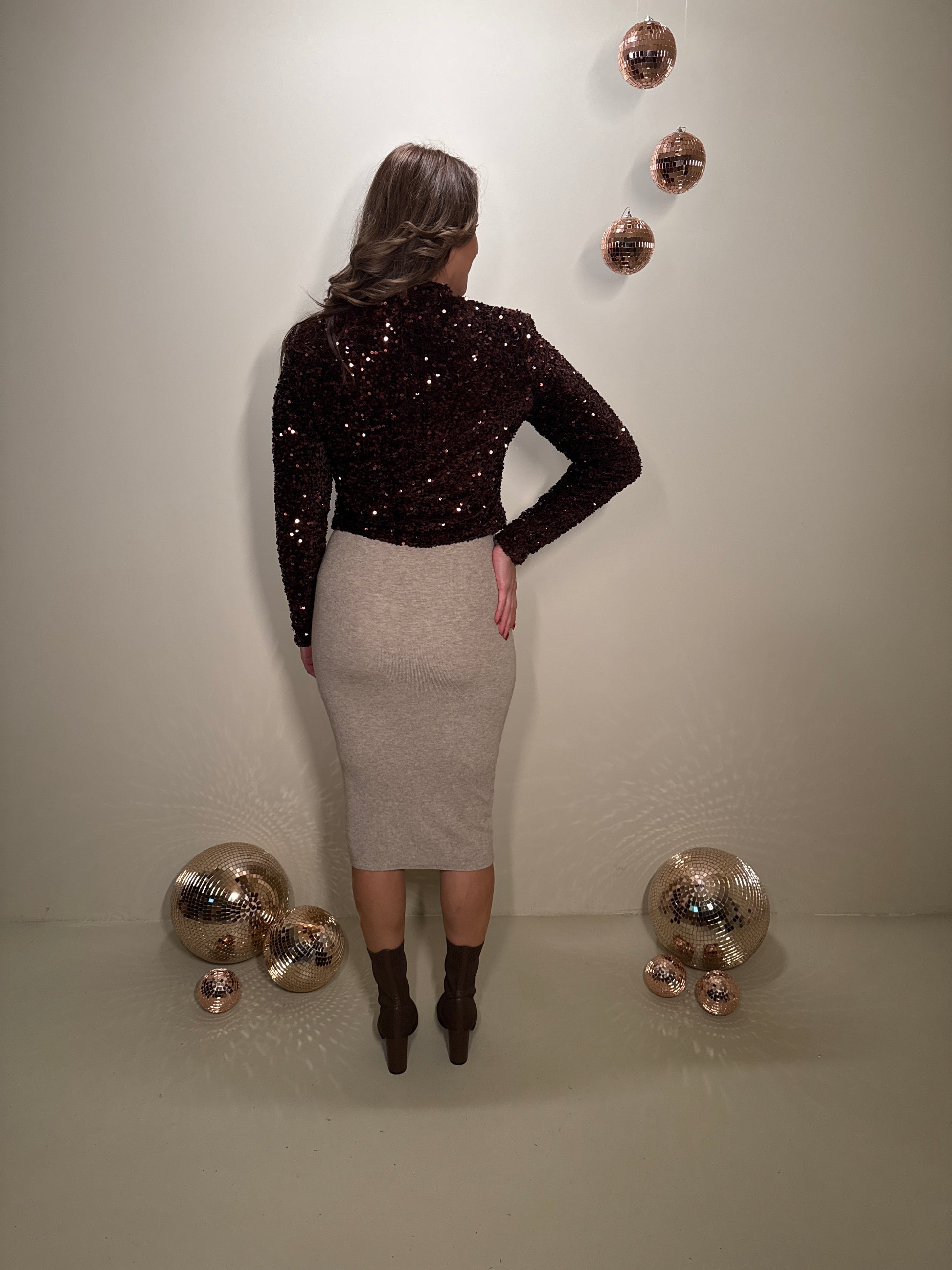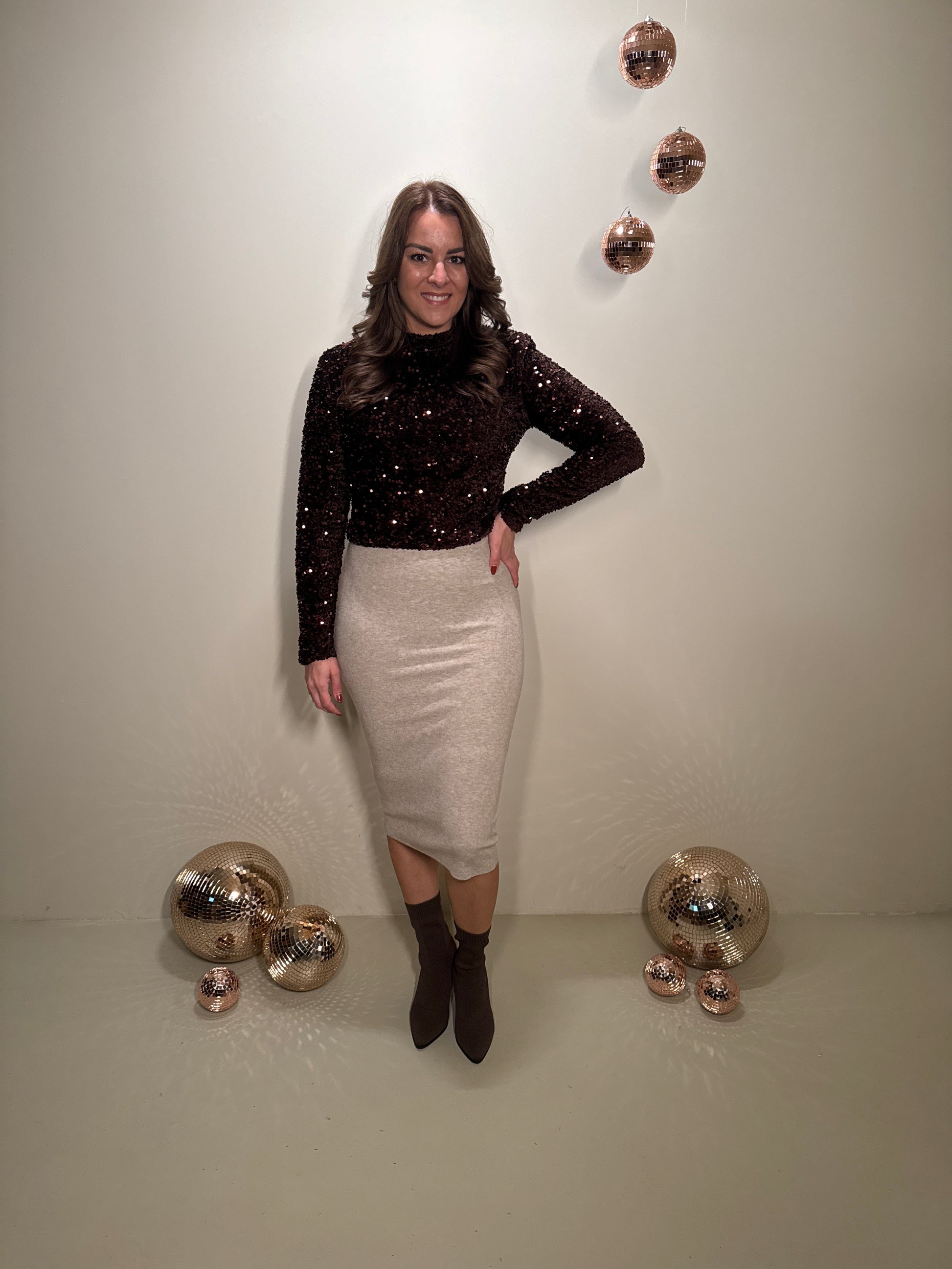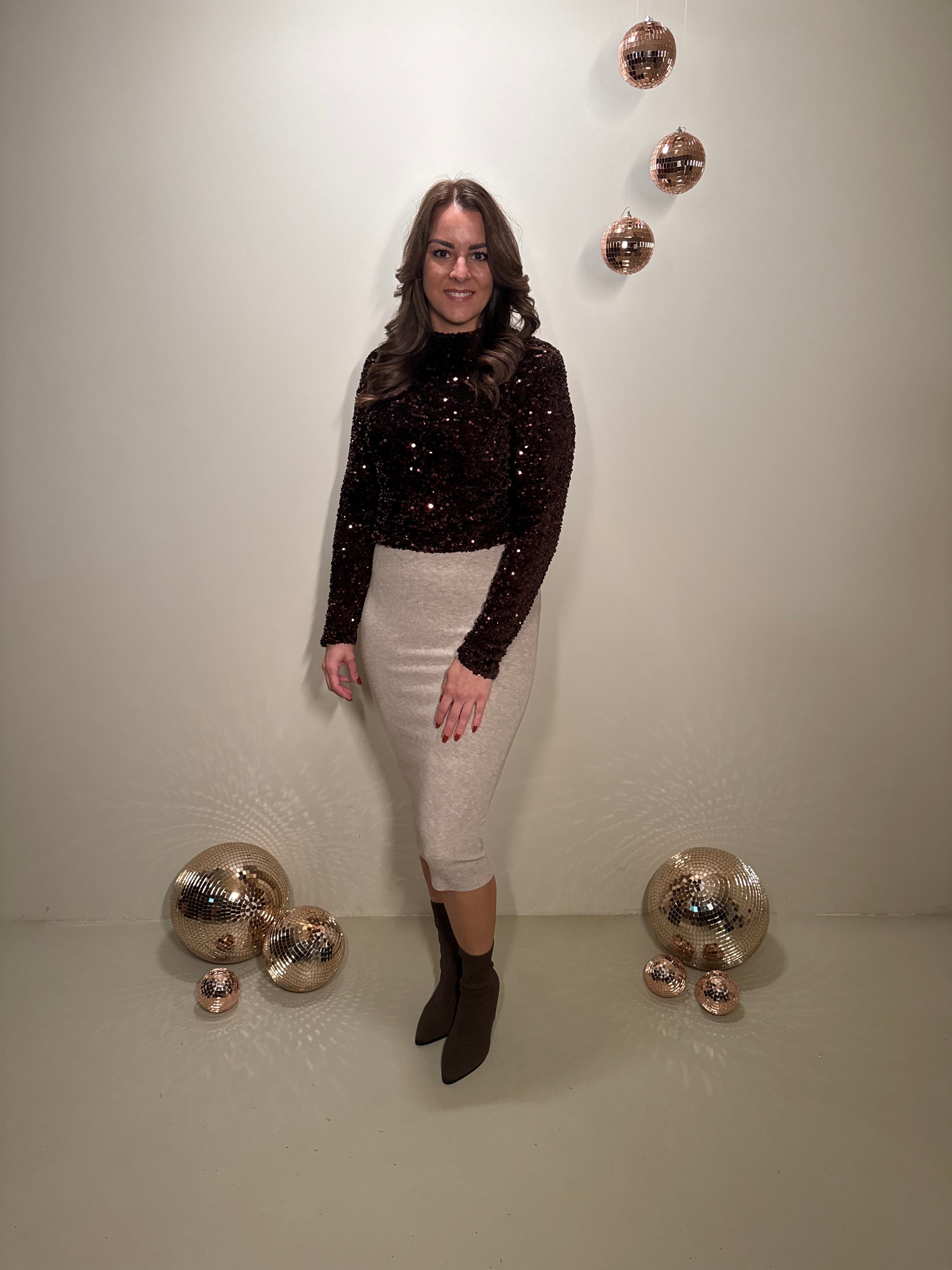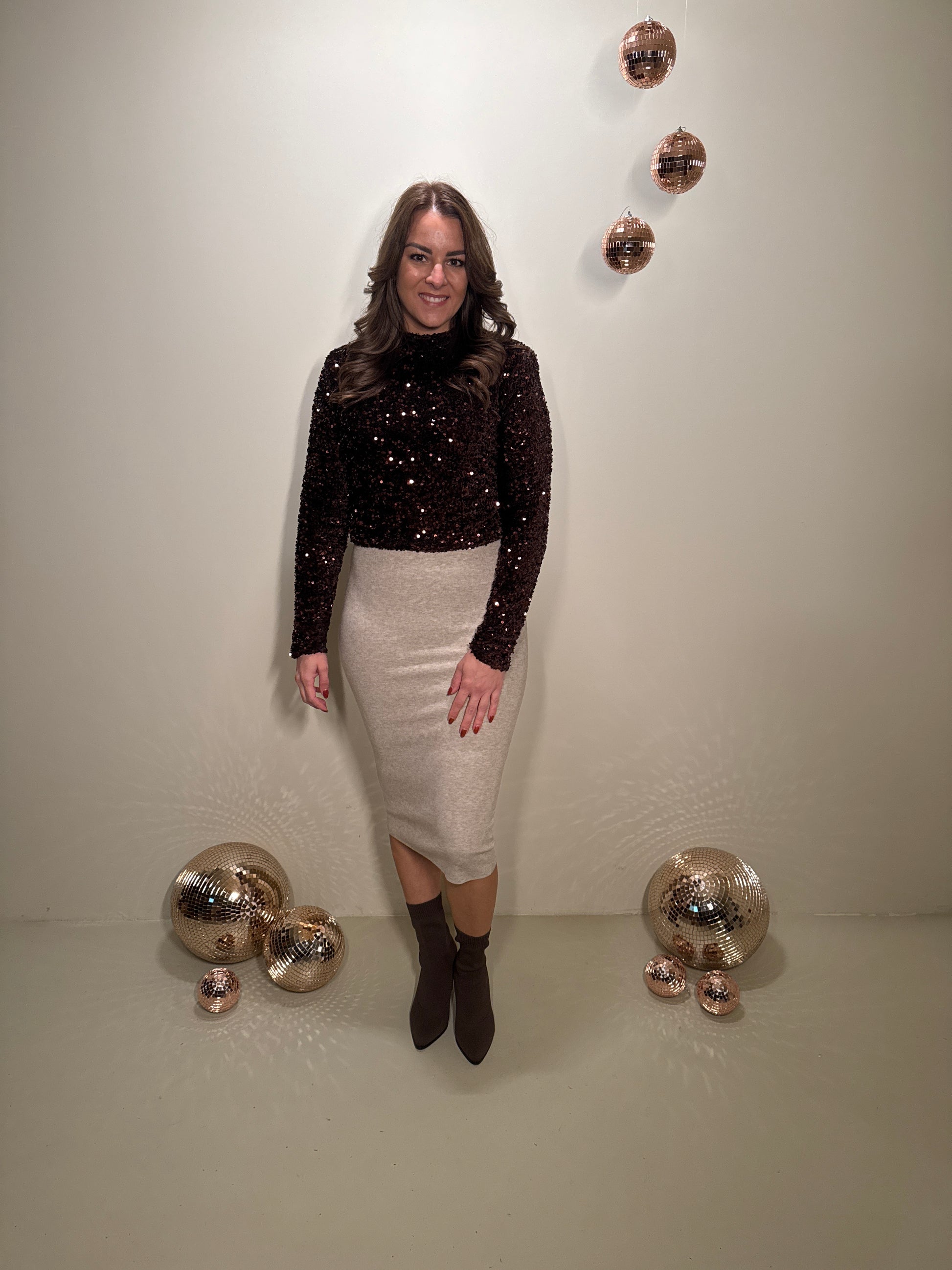 Deze top is gemaakt om in te schitteren. De rijke bruine pailletten vangen prachtig het licht en geven een luxe uitstraling. De rechte pasvorm valt soepel rond het lichaam en biedt genoeg ruimte om ook zwanger te dragen. De subtiele col en lange mouwen zorgen voor een elegante balans tussen feestelijk en comfortabel. Dankzij de rits aan de achterzijde trek je haar makkelijk aan en blijft de pasvorm mooi.