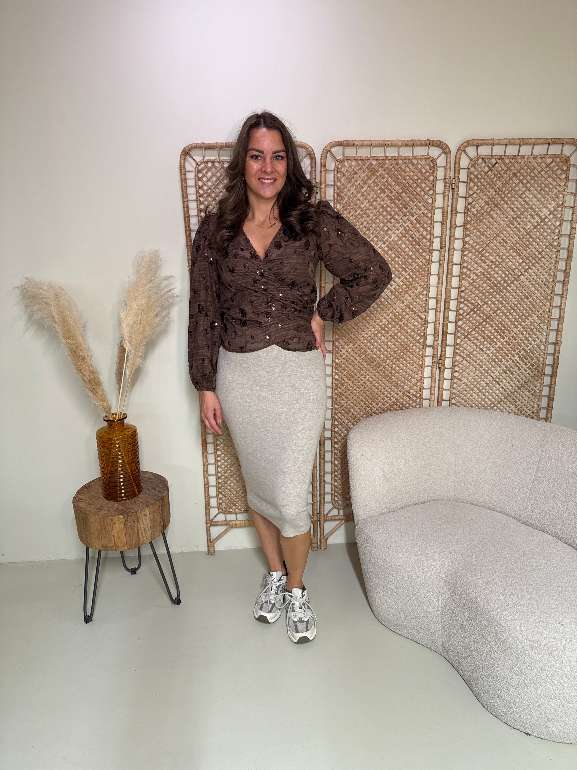 Deze is een vrouwelijke wikkeltop met subtiele pailletten die het licht prachtig vangen. De soepele polyesterstof valt elegant om je lichaam, terwijl je zelf bepaalt hoe strak of los je haar wikkelt — ideaal dus ook tijdens je zwangerschap. De strik in de taille accentueert je silhouet op een verfijnde manier en biedt comfort, of je nu zwanger bent of niet. Perfect voor een diner, feestje of een avondje uit.